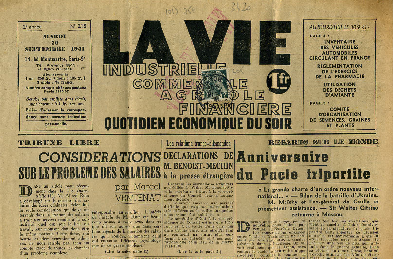 2centimes vert seul sur journal « LA VIE » du 30 septembre 1941.