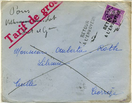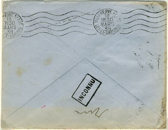 Le timbre a été annulé par le cachet retour à l’envoyeur sur cet lettre expédiée à Tulle et retournée à Villeneuve sur Lot. Au verso, le cachet de Villeneuve sur Lot du 18 mars 1939 constate la date de retour.