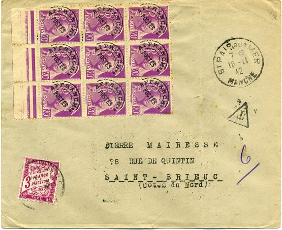 Cette lettre portant un bloc de 9 (soit 1,80 pour la lettre simple à 1,50 au tarif du 5 janvier 1942) a été considérée comme non affranchie et taxée comme telle à 3 francs soit deux fois la somme manquante.