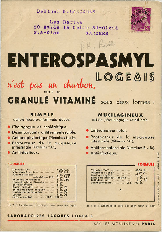 Un timbre de roulette affranchi ce document de promotion du laboratoire pharmaceutique Logeais.