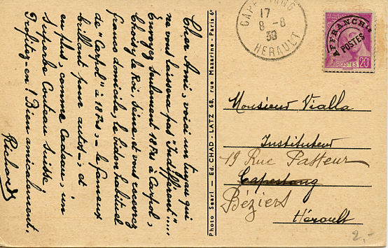 La réexpédition de cette carte publicitaire de Capestang vers Bézier est matérialisée par un cachet du 8 août 1939.