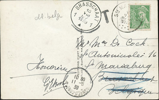 Cette carte postale avec juste la signature est oblitérée en Belgique le 16 août 1939. Elle a été expédiée de Monaco le 11 août avec un timbre français et donc considérée comme non affranchie. le timbre n’a pas été oblitéré à Monaco et la carte frappée d’un T pour marquer la taxte.