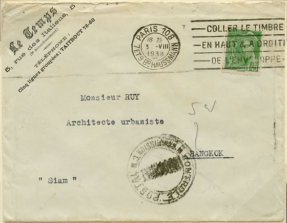 Cet imprimé pour la Thaïlande envoyé de Paris le 3 août 1939 porte une censure de Saïgon.