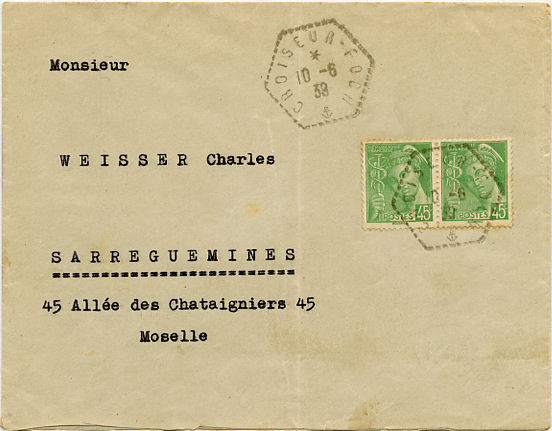 La lettre simple au tarif du 17 novembre 1938 passe à 90 centimes soit deux 45 centimes.