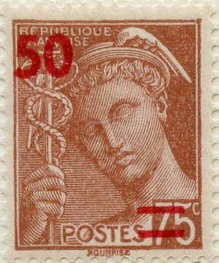 Pour écouler les stocks de timbres restants et faire disparaitre au plus vite la légende « RÉPUBLIQUE FRANÇAISE » , il a été décidé de surcharger les timbres ne correspondant plus à un tarif en valeur ou en couleur. Les nouvelles valeurs ont été choisie pour correspondre à un affranchissement existant tout en restant inférieur à la faciale initiale. Le tarif de la lettre intérieure simple étant de 1 franc, on trouvera donc des surcharges à 50 centimes pour un usage en paire et des surcharges à 1 franc. A noter le cas du 35c semeuse qui reçut une surcharge à 30 centimes (imprimé intérieur 1er échelon). Pour les timbres gravés, on se contentât d’en diminuer la valeur de moitié.