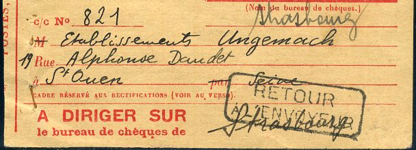 Le nom de l’établissement destinataire est correct, mais pas son adresse.Un tampon au dos mentionne la rectification de l’adresse à Strasbourg. Ce qui motive le retour à l’envoyeur.