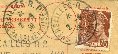 Mandat carte affranchi avec un 75c brun rouge (416A) pour le versement de 31.21F sur un Compte Chèque Postal envoyé de Versailles le 2 septembre 1939.